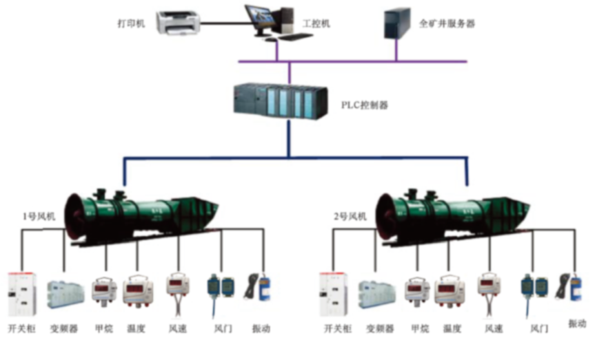 煤矿通风机监控系统 煤矿通风机监控系统由监控计算机、PLC控制柜(数据采集和控制)、系统软件、现场传感器(振动传感器、负压传感器、差压传感器、CH4传感器器)等组成,实现了对通