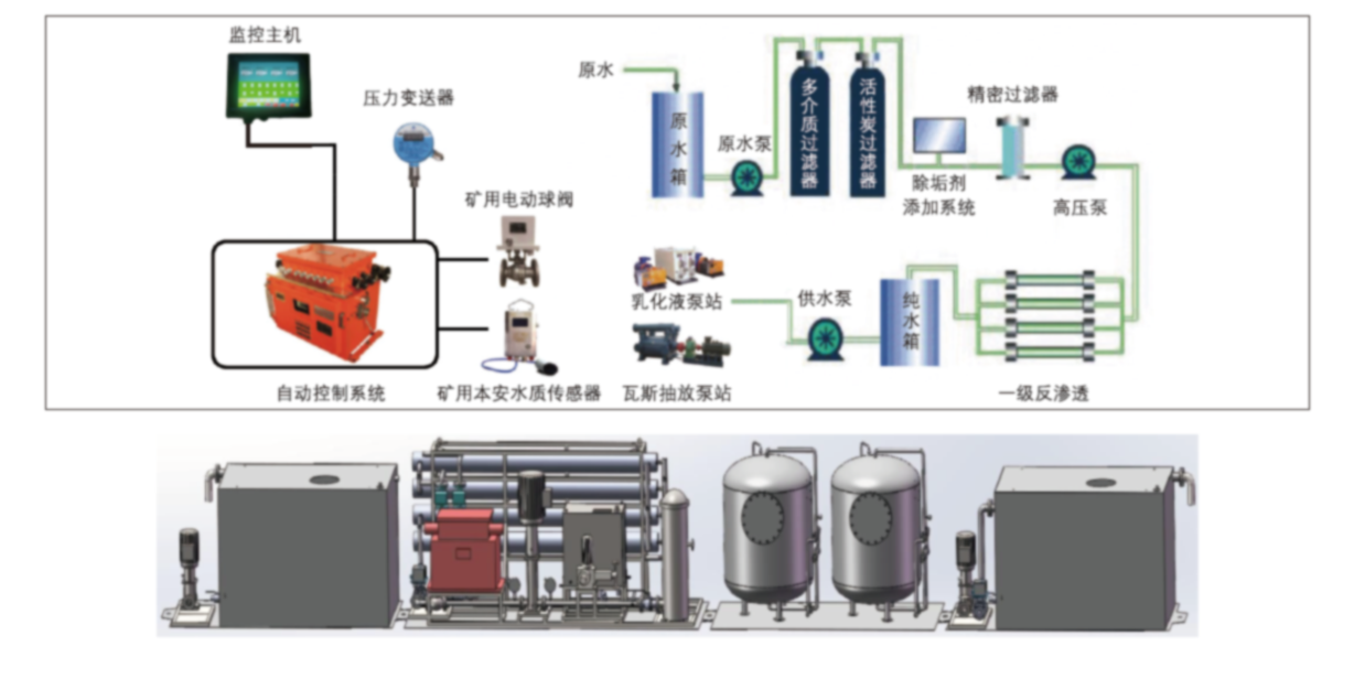 矿井设备用水处理系统是一套基于反渗透膜分离及多级过滤技术、智能检测与控制技术,对矿井用水进行分级处理、深度净化,同时集监测监控、自动控制、水质在线监测等功能于一体